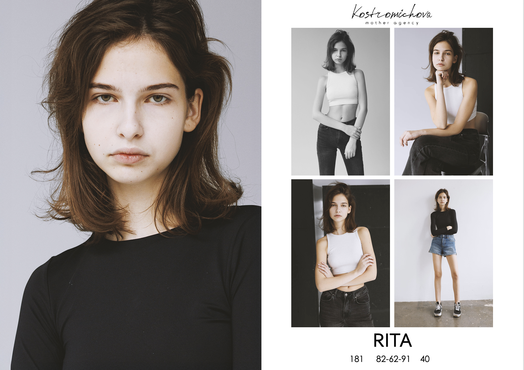 RITA Book Snap Show Comp card height: 181 bust: 82 waist: 62 hips: 91 eye: green hair: brown shoe: 40 Download