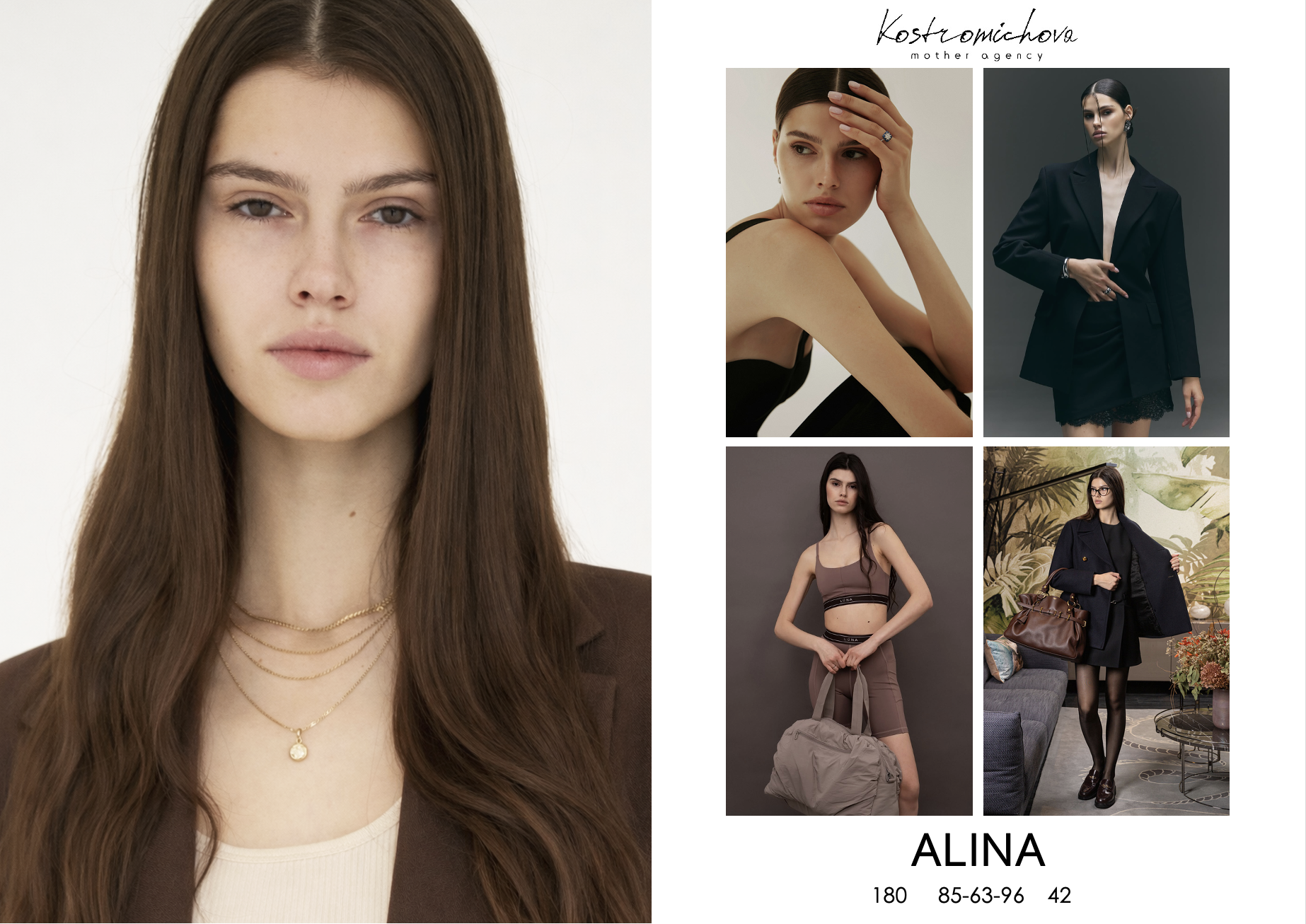 ALINA Book Snap Show Comp card height: 180 bust: 86 waist: 62 hips: 95 eye: brown hair: brown shoe: 42 Download